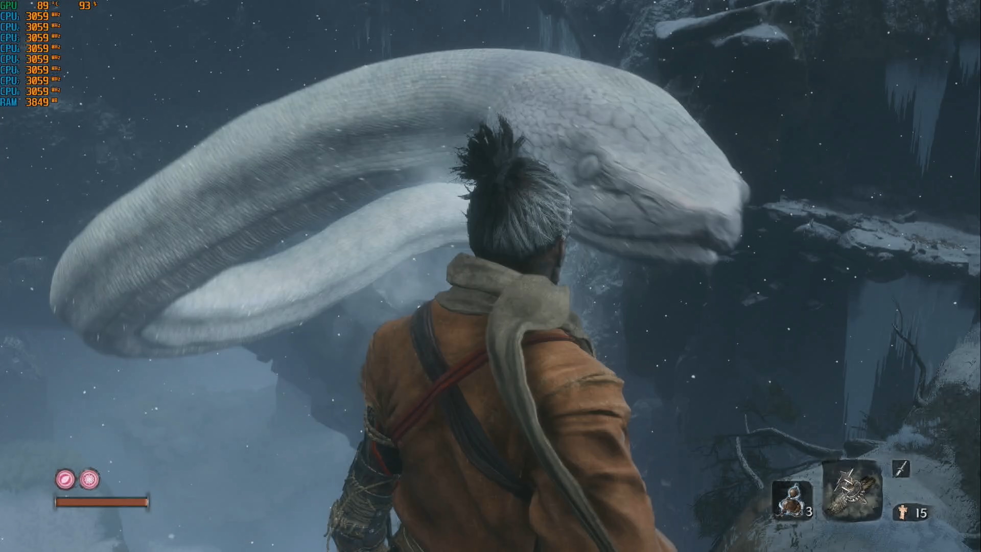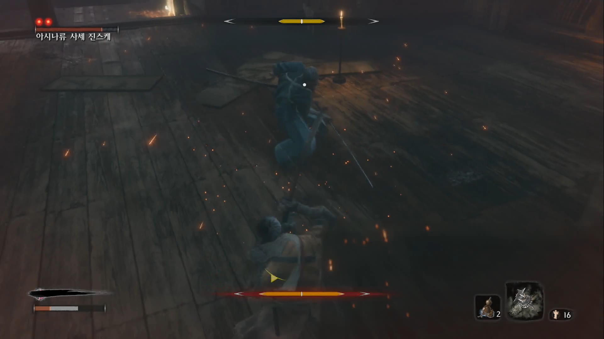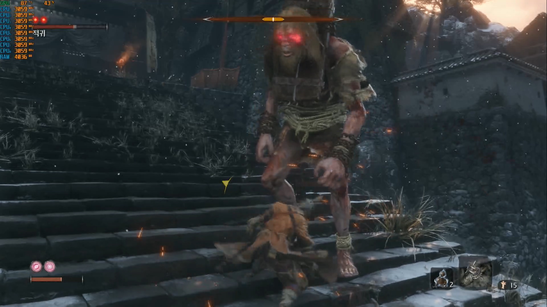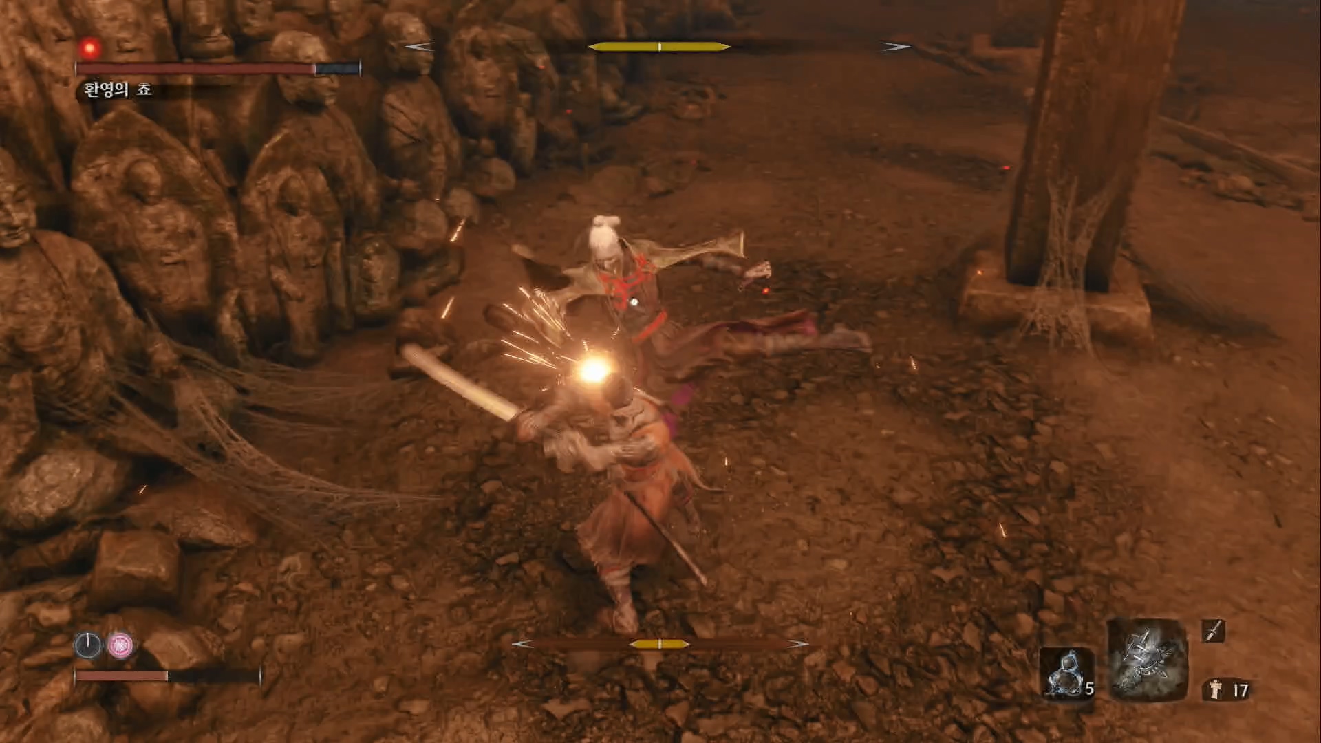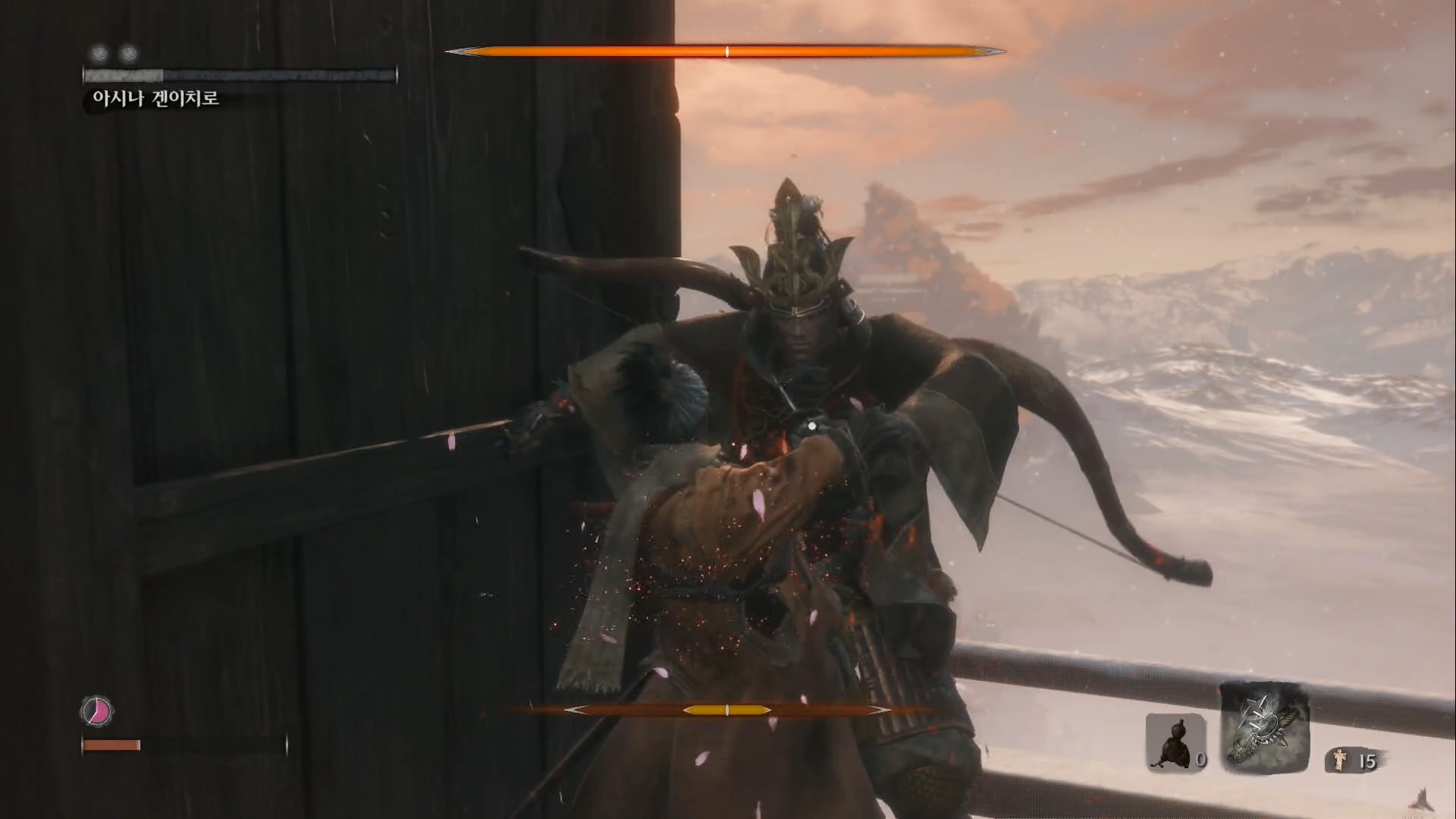 성장하는 재미가 크지 않습니다. 다크소울처럼 직업이 있는것도 아니고, 무기를 획득하지도 않습니다. 초반에 받은 검 한 자루와 스킬 개방뿐입니다. 다크소울은 여러 가지 무기와 마법을 바꿔가며 사용하는 재미가 있었만 세키로의 오의 기술은 보기와 달리 대부분 쓸모가 없어서 기본 공격만 씁니다. 평타로도 끝까지 갈 수 있는게 장점이기는 하나 다크소울처럼 반복해서 플레이할 여지는 적지 않나 싶습니다.