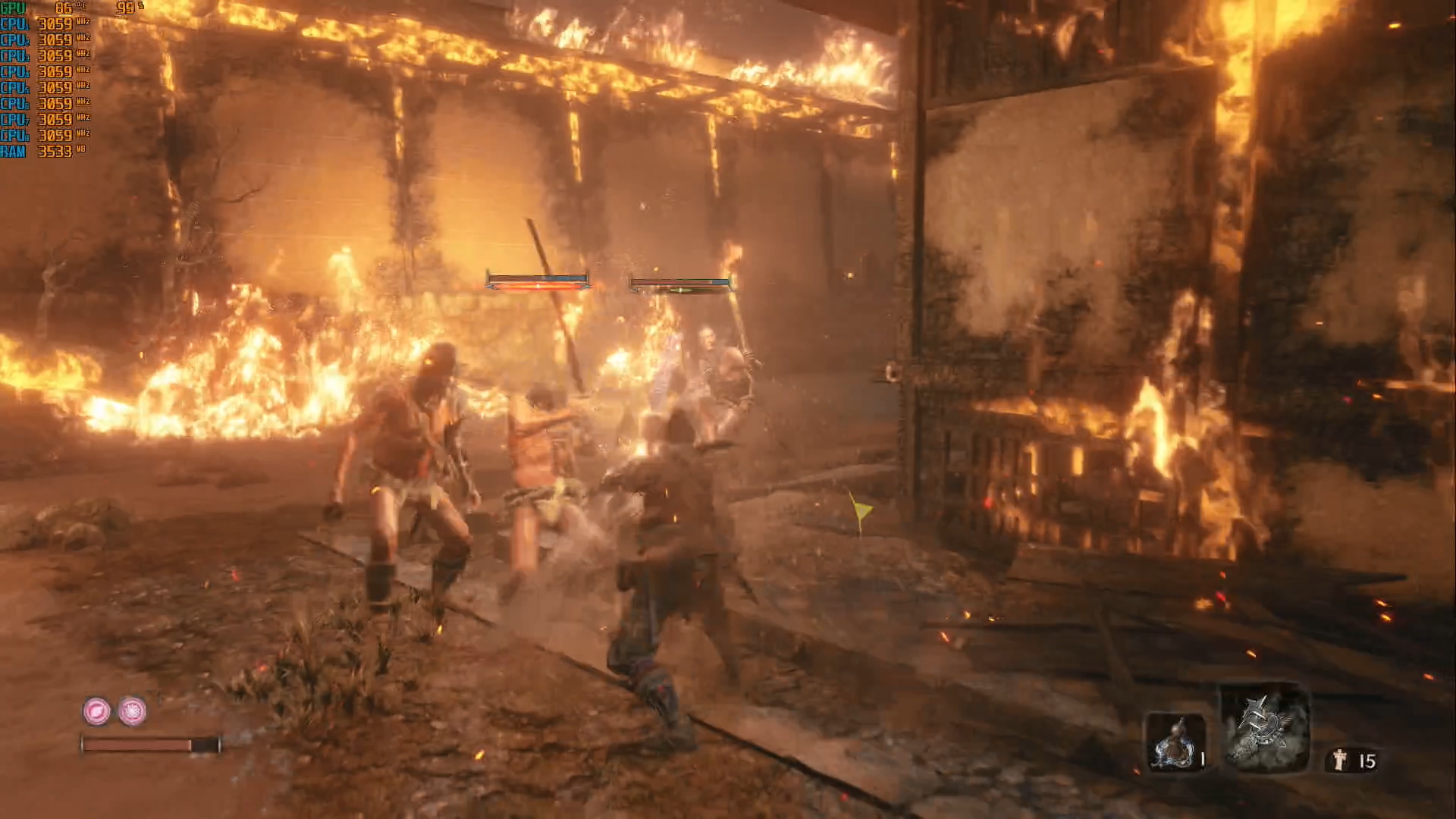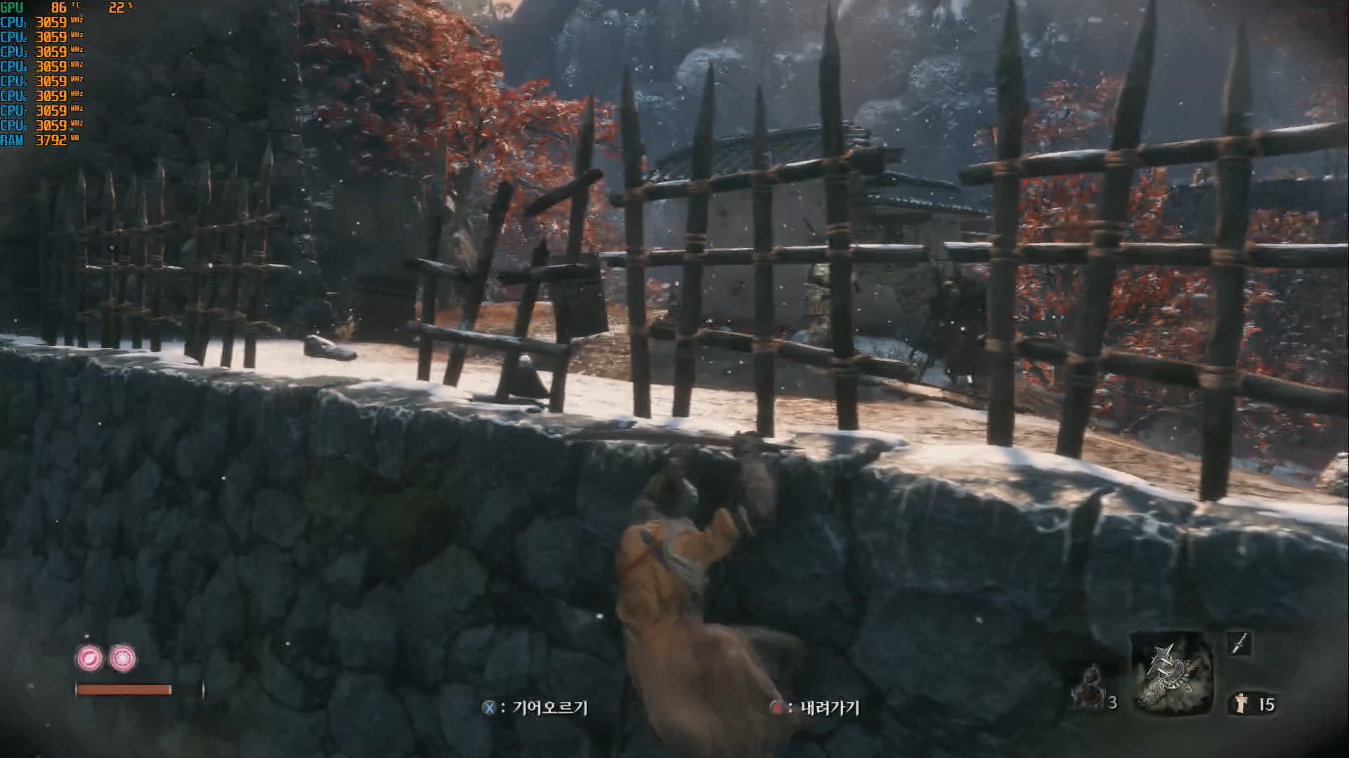 여전히 액션은 X,Y축입니다. 점프와 닌자의수도 도입되고 해서 X, Y에 Z 축 이 있는 액션을 기대했지만 게임이 다크소울과 또 크게 다를 건 없습니다. 회피가 튕겨내기로 바꿔었을 뿐입니다. 기대를 했던 건. 닌자답게 위, 아래로 이동해 가면서 현란하게 싸우는 이미지를 그렸지만 전투는 평면적입니다.적들이 수직으로 쫓아오고 하는 액션은 없습니다. 플레이에 따라서 장점이 되기도 합니다. 인살에 실패하거나 도주를 할 때 상하로 움직이면 적들은 바보가 됩니다. 한 숨 돌릴 여유가 생깁니다.