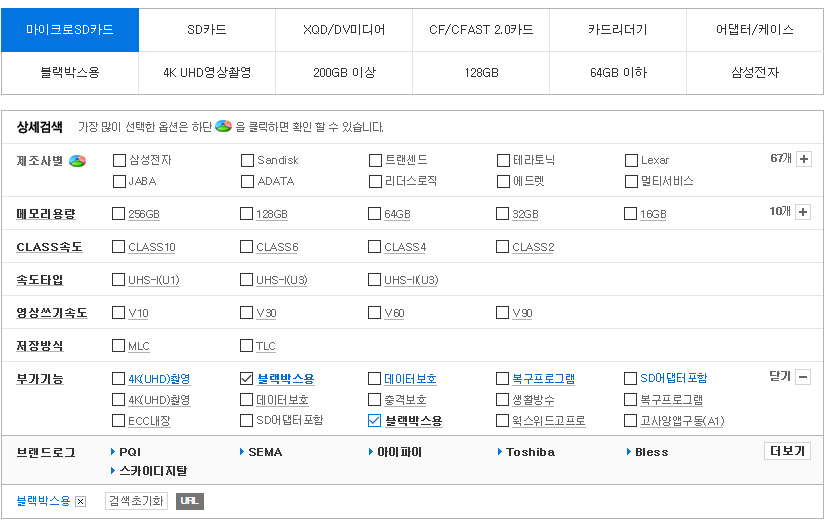 네이버 쇼핑도 괜찮지만 가장 좋은 검색은 가격비교 다나와입니다. MLC와 TLC 방식을 구분할 수 있고, 블랙박스 메모리만 따로 볼 수도 있습니다.