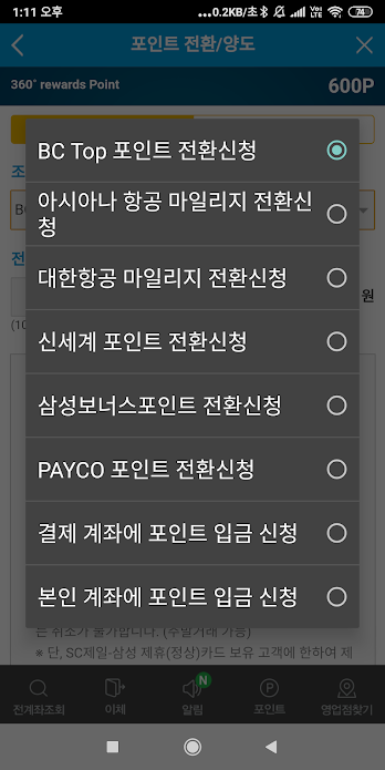전환이 굉장히 다양합니다. 놀랐음. BC 탑 포인트. 항공사 마일리지. 신세계. 삼성, 페이코. 가장 좋은 건 본인 계좌에 포인트가 입금이 된다는 점. 이게 가장 좋은 거죠.