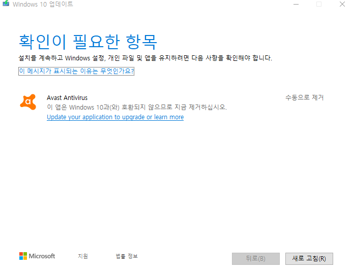 미뤄놓았던 윈도우10 version 1903 업데이트가 자동으로 진행되었습니다. 업데이트 설치 도중 문제가 생겼는데 안티 바이러스 백신인 avast(어베스트)의 호환성 문제로 진행이 되지 않는다는 메시지였습니다.