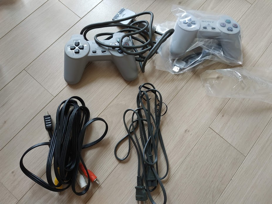 AV케이블과 전원 케이블. 플레이 스테이션 오리지널은 프리볼트가 아니기 때문에 그냥 돼지코로 끼워서 코드에 넣으면 터집니다. 변압기 사용해서 전압을 맞춰줘야 합니다. 이도 옛날 일본 전자기기 쓸 때 이야기지. 요즘에는 필요한 일이 없습니다. 지금 일본산 전자기기는 디지털카메라, DSLR 빼면 생각나는 게 없네요. 시대가 참 많이 변했습니다.