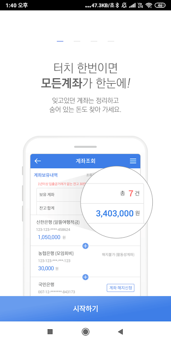 모든 계좌를 한 번에 볼 수 있다. 시작하기를 터치