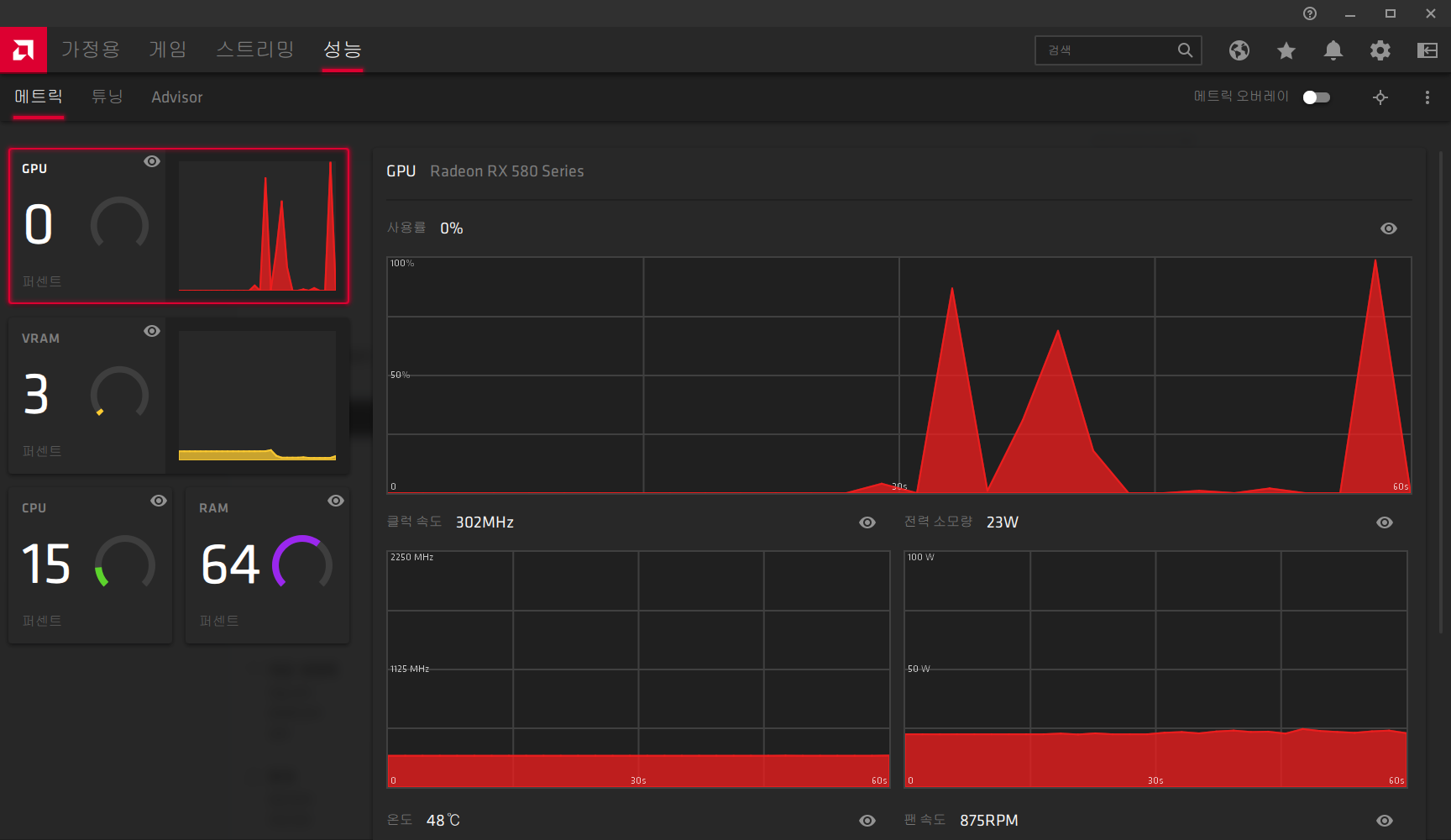 라데온 그래픽카드 드라이버가 최신 아드레날린2020으로 바뀌고 난 뒤 인터페이스가 바뀌었습니다. 바꿔서 좋은 건지는 잘 모르겠고 깔끔해진 거 같습니다. 성능 그래프를 보는 게 더 편해졌고.