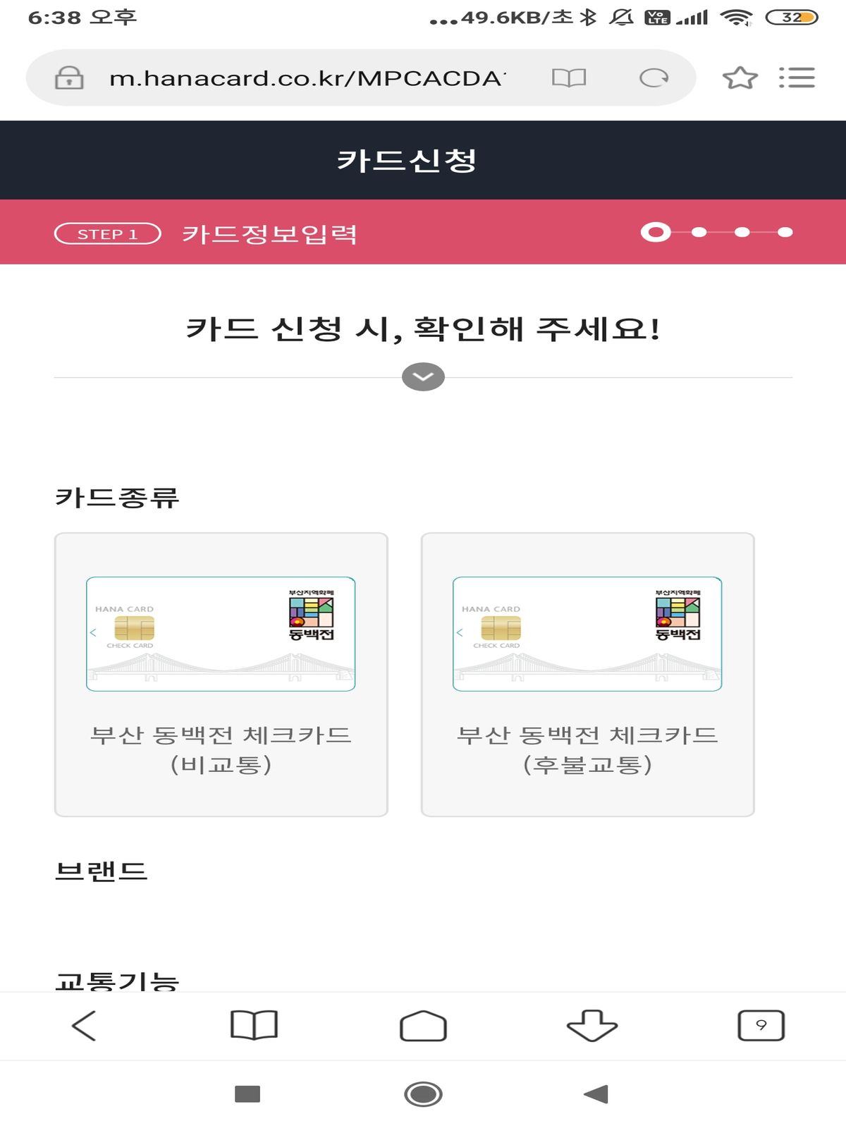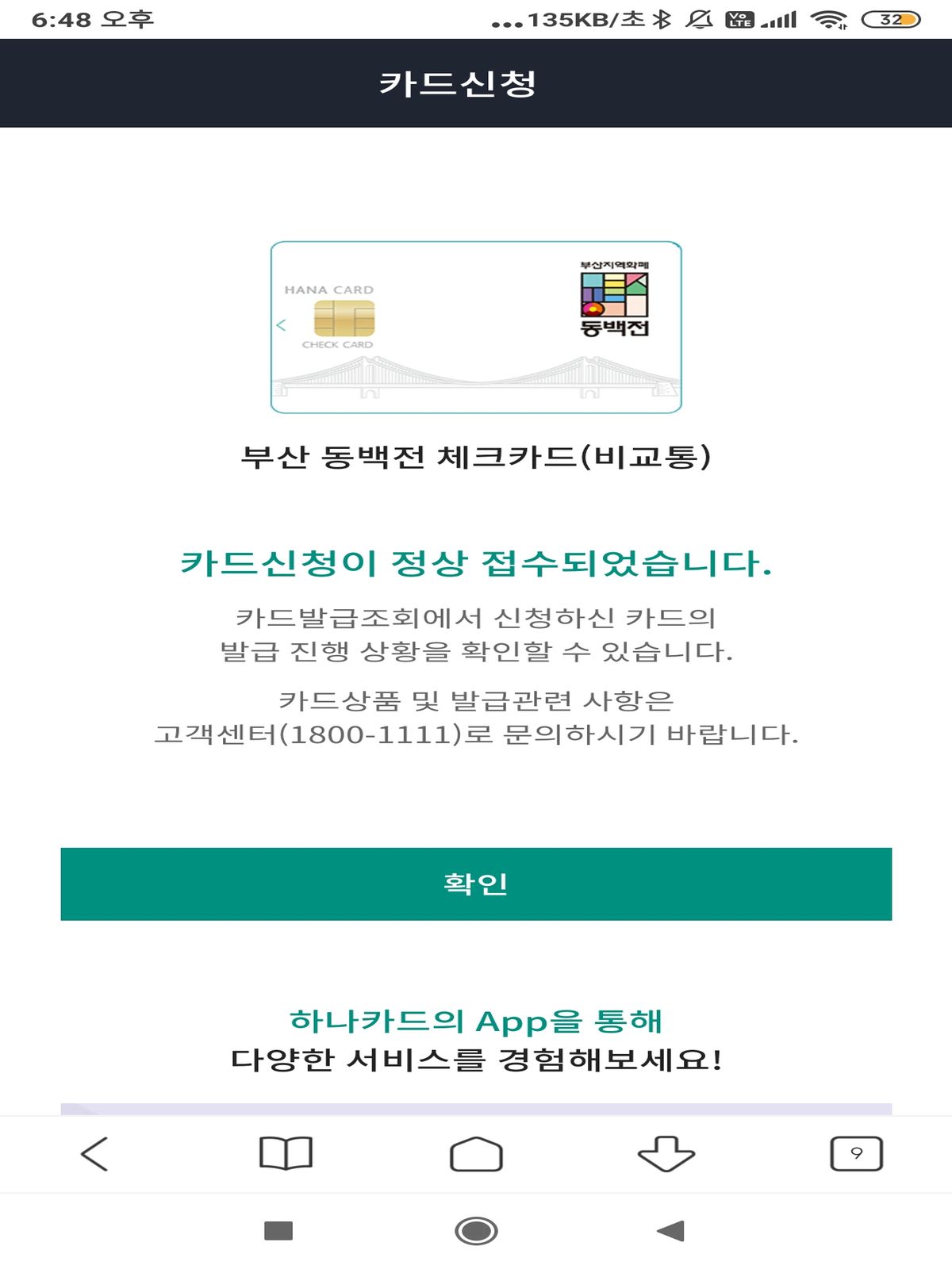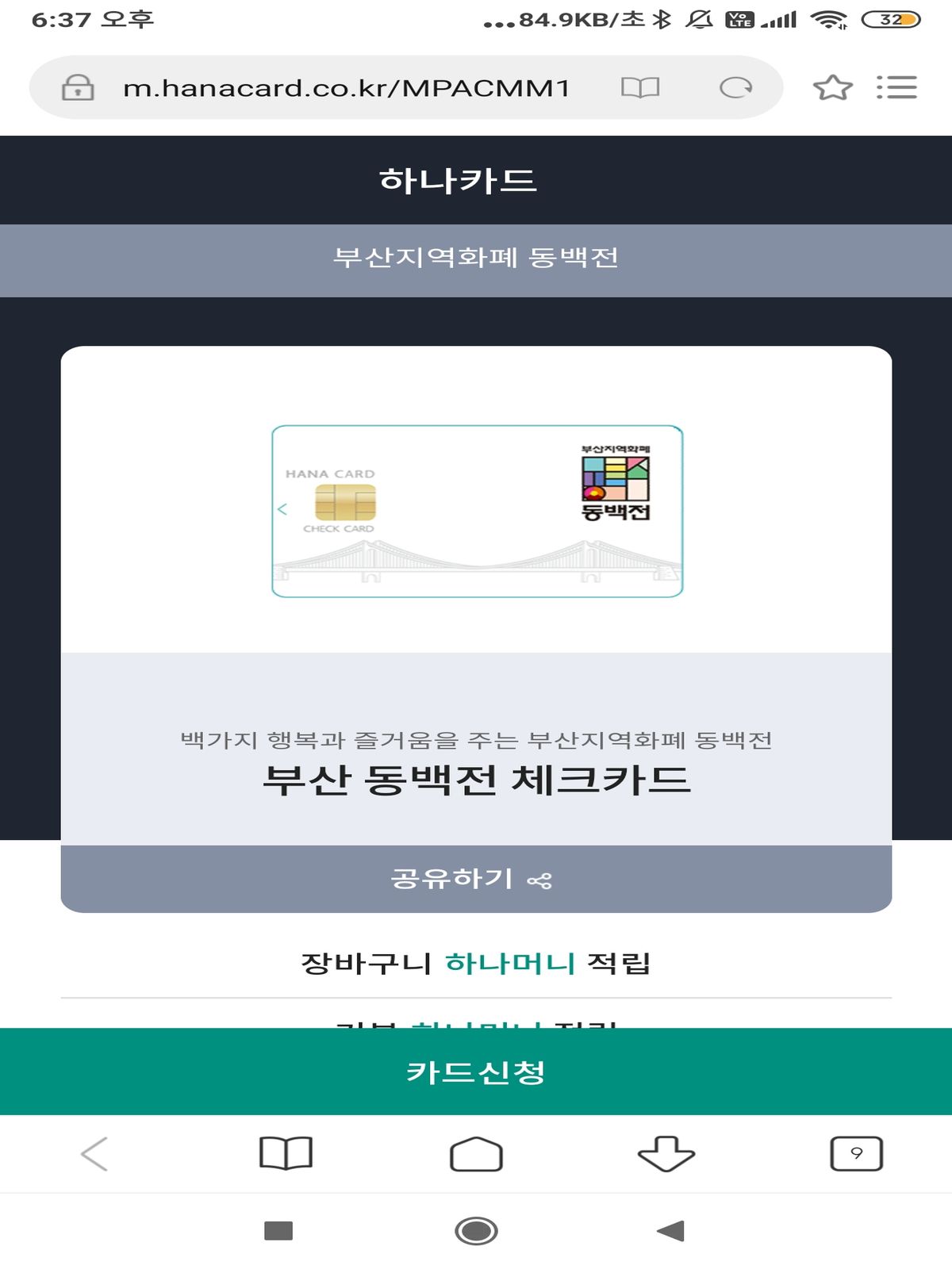 이제 실물 동백전 카드를 발급받아야 합니다. 카드는 체크카드로도 사용할 수 있고 동백전 혜택도 받을 수 있습니다. 하나카드와 부산은행카드가 됩니다. 부산은행이야 지역은행이니 당연한데 하나은행은 뜬금없는??? 하나 은행 지점도 많지 않은데. 은행 지점으로 가면 바로 카드를 받을 수 있고 우편으로는 신용카드와 같은 절차입니다.