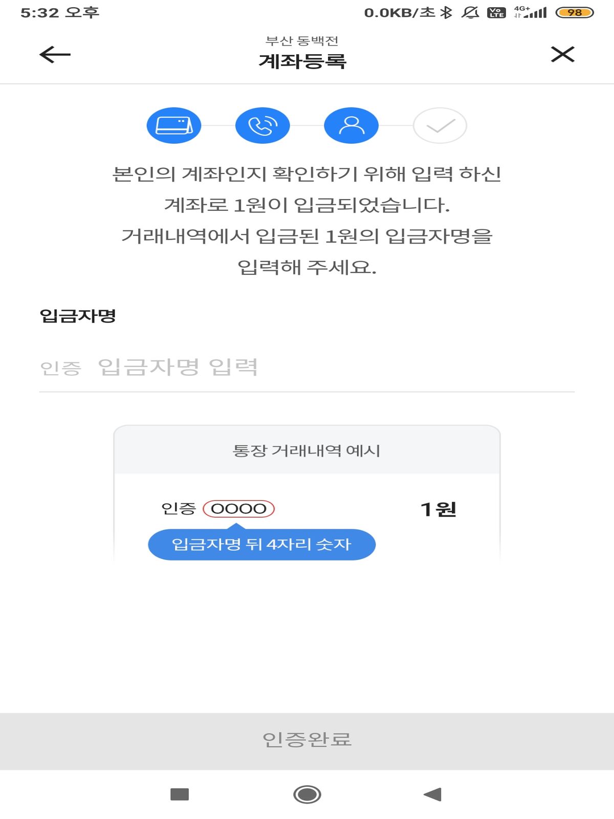 자신의 계좌에 인증 땡땡땡땡. 로 1원이 입금되는데. 4자리 숫자를 넣으면 됩니다. 신박한 인증방법이군요. 저렴한 비용에 간단한 방법인 듯.