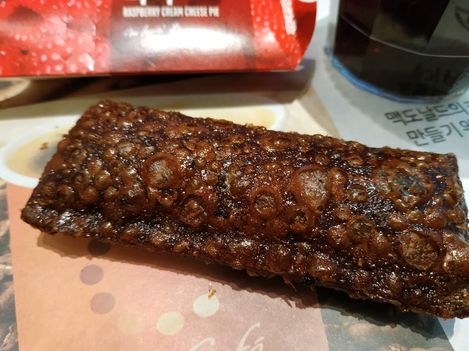 파이니까 뜨근하게 나오고요. 식감도 나쁘지 않네요. 치즈와 라즈베리가 괜찮네요. 디저트로 커피 한 잔에 먹기 정말 괜찮게 보입니다. 맥도널드가 메뉴가 연이어 너프를 먹어서 소위 인터넷 유행어로 'X렬'이 되었었죠. ( 당사자가 듣기 좋은 말이 아닌 유행어로 가렸음. ) 점점 갈 이유가 없어져 발길을 줄였습니다.