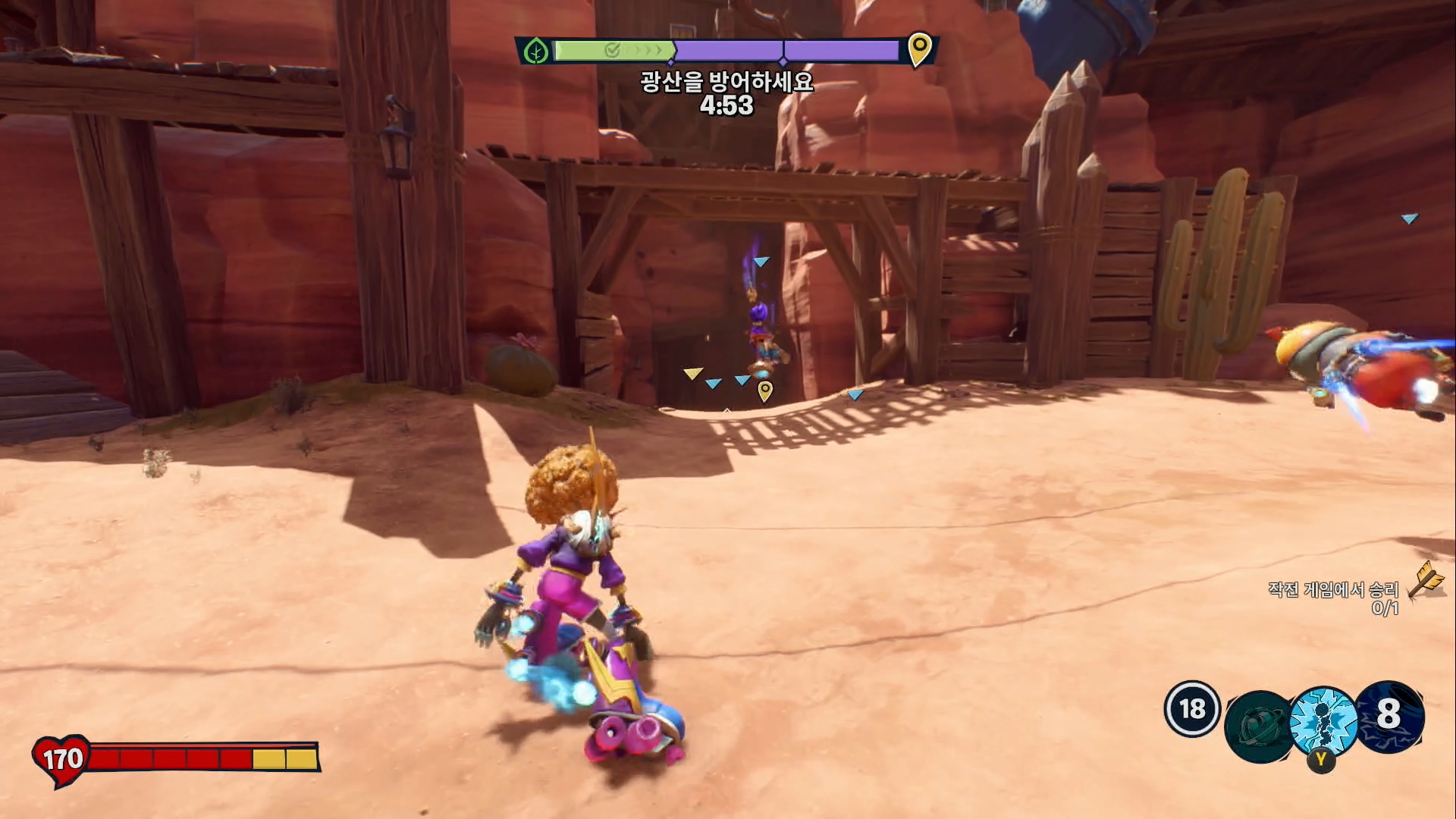 네이버 빌은 방어 진지까지 달려 나가야 해서 곧바로 전투에 참여하기도 쉽지 않습니다. 상대팀의 점령 게이지가 쭉쭉 올라가고 점령 완료! '좋은 시도였어요.' 다음번에도 같은 일 반복. 방어를 해보려고 해도 무슨 의미가 있나? 팀 밸런스가 맞으면 뚫느냐 막느냐는 접전이 일어납니다. 아마 개발자들도 이런 모습을 의도했을 겁니다. 현실은 그냥 진지로 뛰기 바쁘고 도착하면 점령 완료. 빨리 끝나는 건 장점이라고 해야하나요?