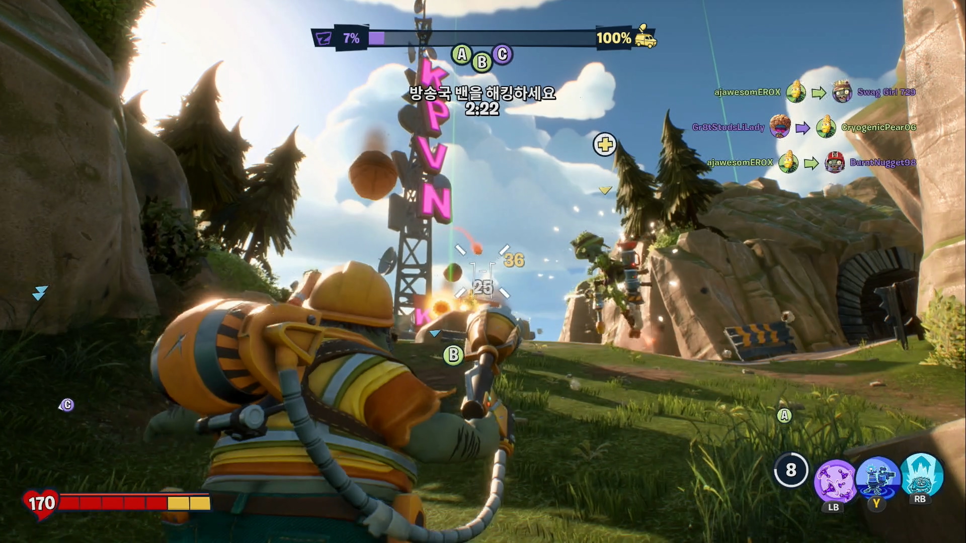 가든 워페어의 장점은 공짜 킬입니다. 그렇게 생각했습니다. 다른 게임과 비교해 봤을 때 킬 따내기 쉽습니다. 조준에 자신이 없다. 손이 느리다. 그러면 먹개비를 선택해서 버로우를 해서 잡아먹기로 원킬을 내던지, 과학자를 선택해서 순간이동으로 순신간에 접근해서 공격. 올스타처럼 냅다 질러버리고 임프 차기(폭탄 던지기)를 하면 됩니다.