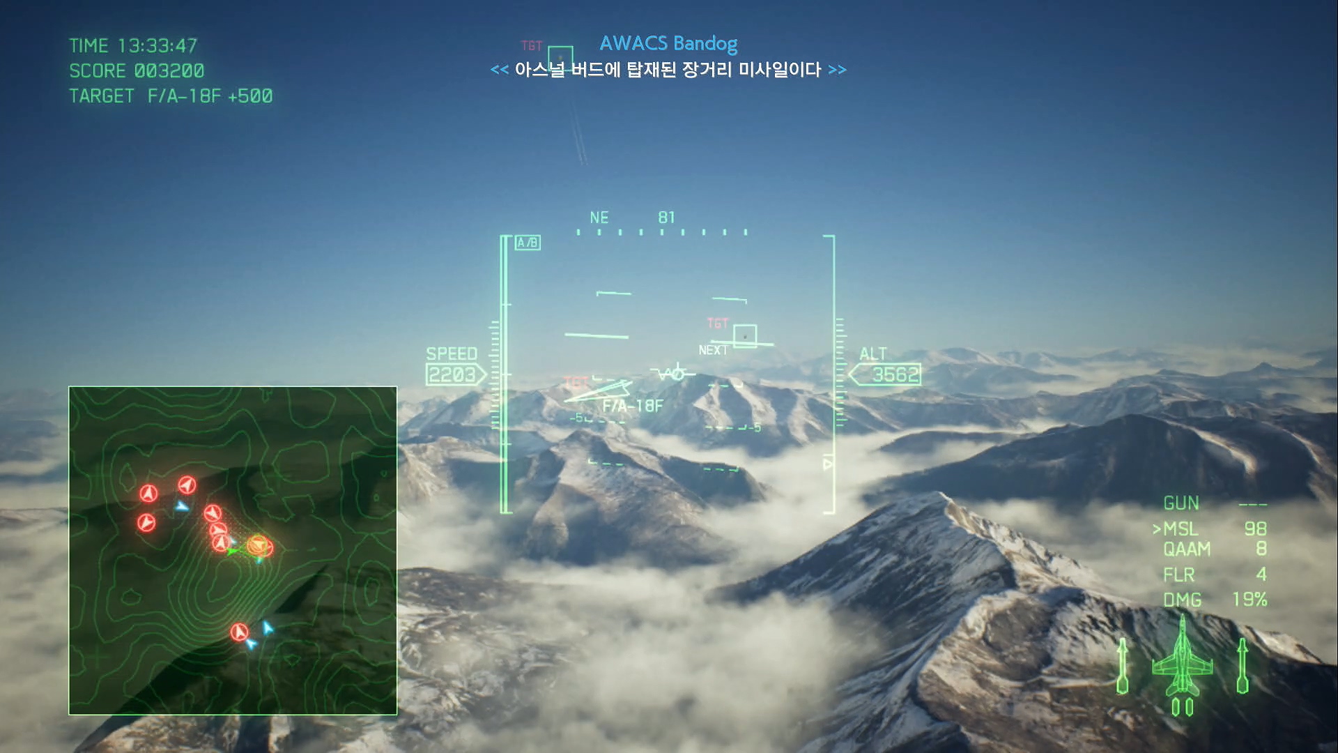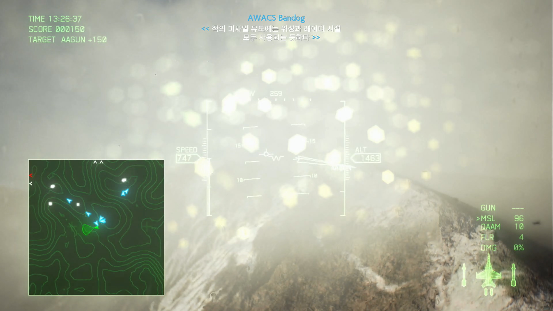 게임 내내 들리는 음성이 미썰! 미썰! 하는 경고음입니다. 적기가 나에게 미사일 발사했을 때 나는 경고음이라 하면서 수도 없이 듣게 될 겁니다. 발음이 미국과 영국이 다르군요. 미국은 [mísəl] 영국은 우리에게 익숙한 [mísail]. 적 미사일 피하랴. 조준해서 미사일 날리랴 게임하는 동안 할 일이 많습니다. 물론 실제 파일럿만큼 많지는 않겠지만요.