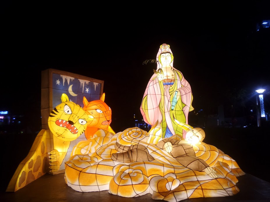 빛이 사라지고 연등이 밝혀지면 꽤 볼만합니다. 연등 아래에는 스폰서인듯한 기업명과 이름이 적혀 있습니다. 연등 크기가 다소 커서 만드는데 돈 좀 들어갔겠는데요. 거북선 모양도 있고, 입구 앞에서 2020년 연등축제 상징형으로 범어사 7층 석탑 등이 있습니다. 앞에서 인증용 사진 하나 박았지만 밤이고 역광이라 촬영이 쉽지 않습니다.