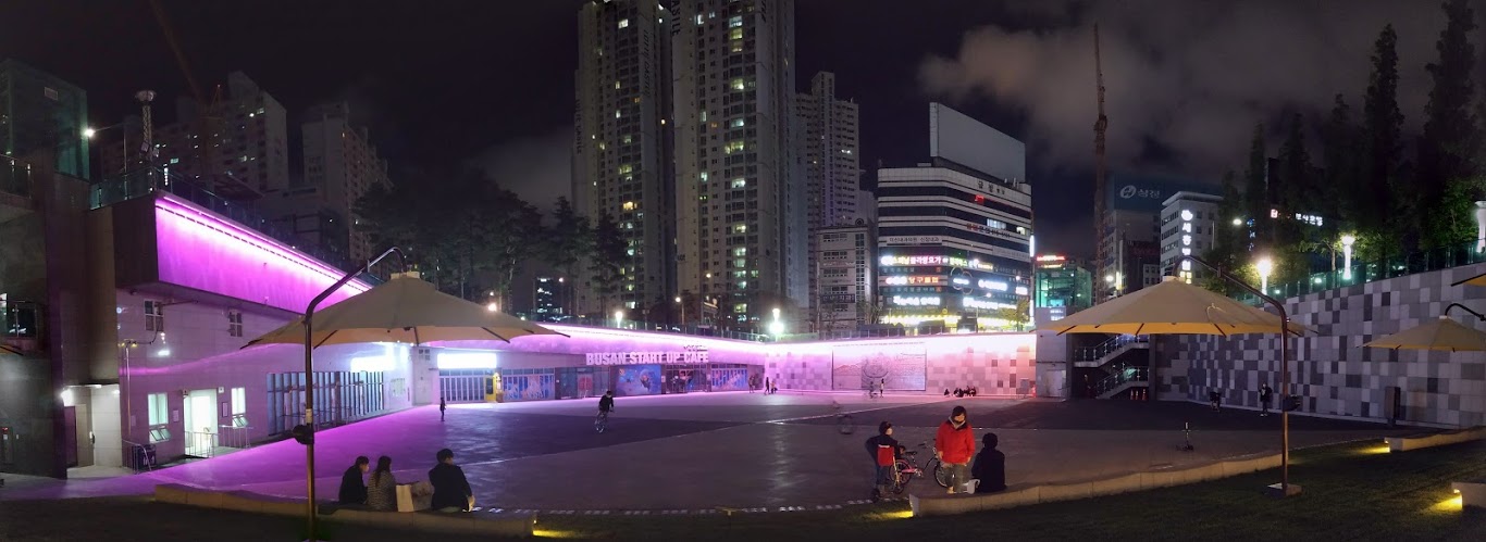 서면, 부전동, 양정, 접근성이 좋은 곳에 위치해서 근처에 들린다면 한 번 와볼만은 합니다. 광장 끝에는 창업카페 공간이 있는데 부산 도심에서 요런 공간을 찾기 쉽지 않습니다. 쭈욱 펼쳐진 넓은 공간 말입니다. 밤이라서 조명도 예쁘게 변하는데, 근방에 살고 있는 사람이라면 산책하기 좋겠어요. 커피 하나 손에 들고 마실 가고 아이들은 뛰어놀고. 코로나로 인해 난리이지만 그러거나 말거나 일상은 이어집니다.