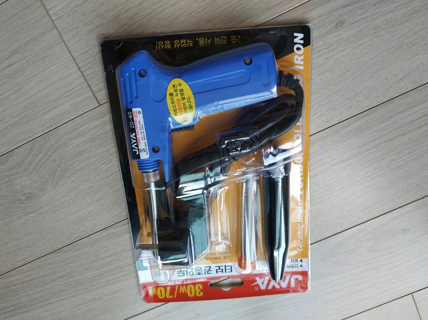 구매한 제품은 권총형 인두기였습니다. 가격은 8,000원대 ( 배송비 포함) 요거보다 더 저렴한 일반적으로 보는 인두기는 5,000원대였습니다. 그냥 더 싼 거 살까 하다. 이게 70W까지 지원을 하고, 손에 쥐기 편한 권총형이라 샀습니다. 구성은 단출합니다. 인두기, 팁 케이스, 실납. 가정에서 인두기 하나 살려면 그냥 세트로 된 거 하나 구매하는 게 나을 거 갔습니다. 막상 사보니까. 인두기 거치대도 필요로 하고, 페이스트도 필요하고, 이것저것 따로 구매를 하느니 세트가 좋겠더라고요.