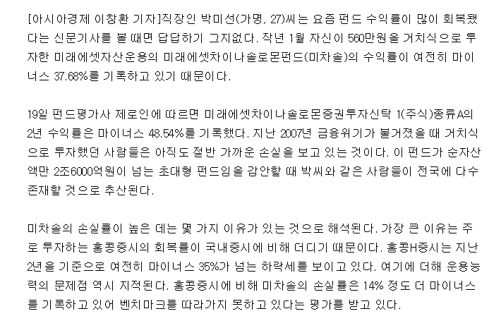 미차솔이 반토막이 났다는 2009년 뉴스. 가장 아래로 찍었던 게 -45%였던가.
