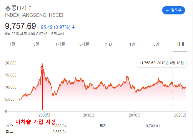참 아름다운 봉우리에서 수직 낙하했습니다. 미래에 내가 보는 과거의 나는 참 멍청한 녀석이군요. 어떻게 잡아도 저 꼭대기를 잡나. 신경을 쓰지 않아서 몰랐었는데. 홍콩 H지수나 상하이 지수 모두 2007년의 그 지수를 회복한 적이 없었군요. 미차솔 때문에 알아봤는데. 오히려 이 사실이 더 놀랍습니다. 분명 금융위기 이후에도 중국 경제도 성장을 했을 텐데. 그 고점에 다가서지도 못했다니.