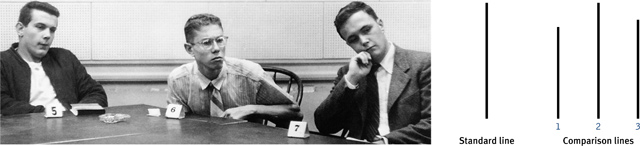 실험실에서 실험대상자를 제외한 참가자들의 짜고 거짓을 합니다. 모두들 3번 직선이 가장 길다고 합니다. 그럴 때 실험대상자는 어떤 반응을 보일까? 많은 사람들이 다른 사람들의 행동과 말에 영향을 받고 자신의 태도를 결정합니다. 2번이 가장 길었음에도 3번이라고 거짓으로 말합니다.