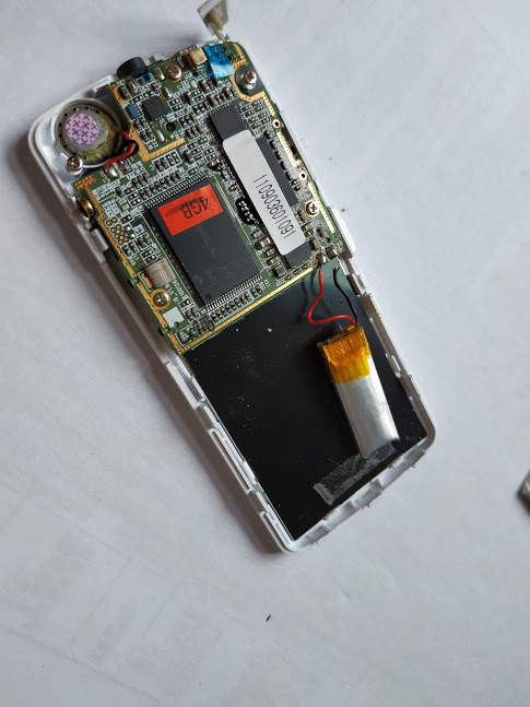 거원 아이오디오 분해. 510mAh 배터리. 4GB 메모리. 스피커가 보입니다. 구조는 단순합니다.