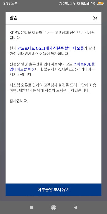 아니, 모두에게 평등하게 안됐습니다. 다행인건가? 안드로이드 11에서 신분증 촬영 시 오류가 일어난다고 합니다. 오늘 (15일) 업데이트한다고 하니 추후 다시 시도를 해봐야겠습니다.