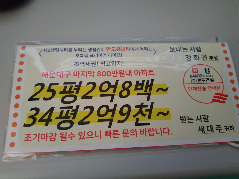 오늘 집으로 돌아오면서 유인물을 하나 받았습니다. 해운대구 800만 원 아파트. 25평형이 2억 8천 어쩌고. 저쩌고. 이런 유인물에는 사은품이 하나식 끼워져 있기 마련입니다.