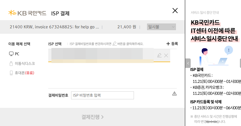 2. ISP 결제가 안되어 또다시 본인인증 요구. ( 공동인증서 필요 )