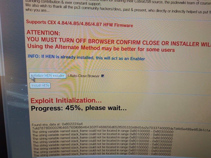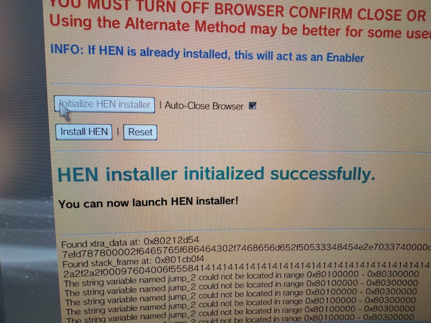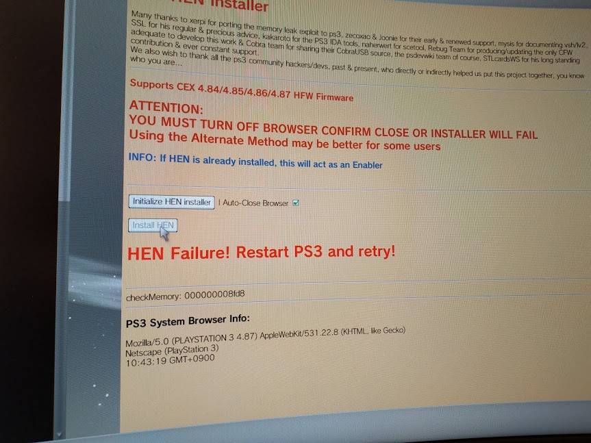 HEN 설치 구간에 알아낸 건 이렇습니다. 실패를 하게 되면 계속 시도를 해보세요. 이게 PSP 커펌할 때와 비슷한데. 같은 방법으로 해도 성공할 때가 있고 실패할 경우가 있습니다. 지시대로 해왔다면 계속 슛을 날려보는 겁니다. 그러면 골인할 때가 있습니다. 간단하죠? 이도 확실하다고 할 수는 없지만 경험으로 얻은 지식입니다.