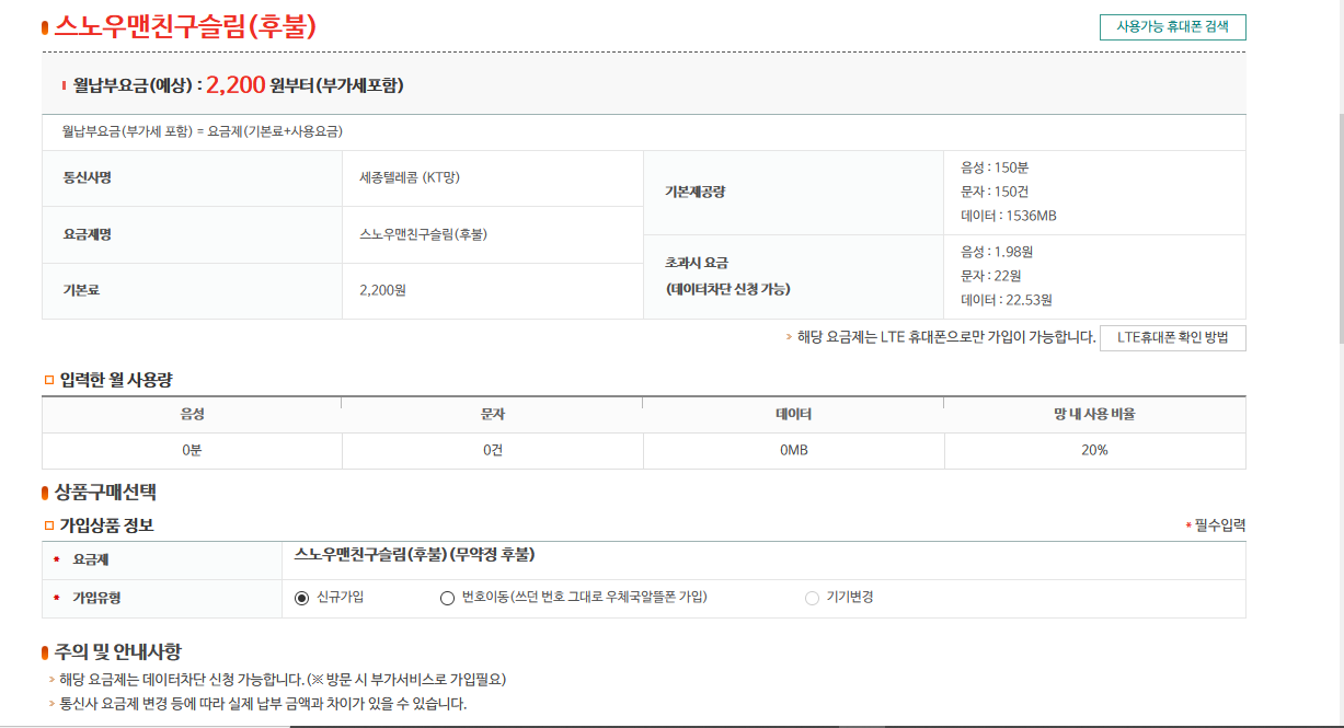 월 2200원에 음성 : 150분, 문자 150건, 데이터 1.5G