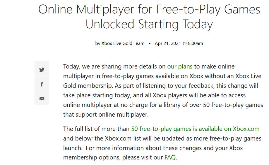 Today, we are sharing more details on our plans to make online multiplayer in free-to-play games available on Xbox without an Xbox Live Gold membership. As part of listening to your feedback, this change will take place starting today, and all Xbox players