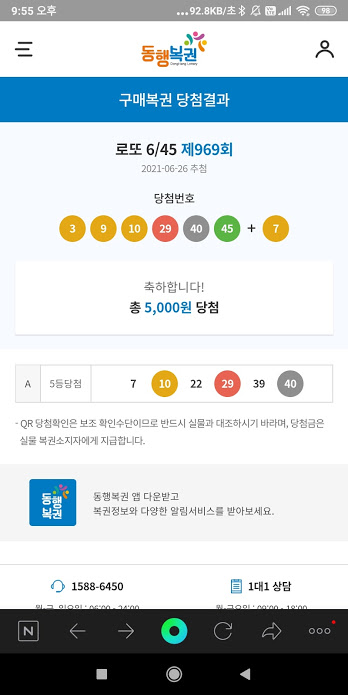 5등 당첨. 번호가 3개 맞았습니다. 평소에 하나도 못 맞추더니. 3개나? 당첨금은 5천 원. 오늘 로또 판매점에 가서 당첨된 복권을 5천 원으로 바꿔 왔습니다. 아마 5등 당첨자 대부분이 재투자(?)를 하겠죠. 앞에 있던 사람도 5천 원 당첨 복권 포함해서 몇 만원식 사가더라고요.