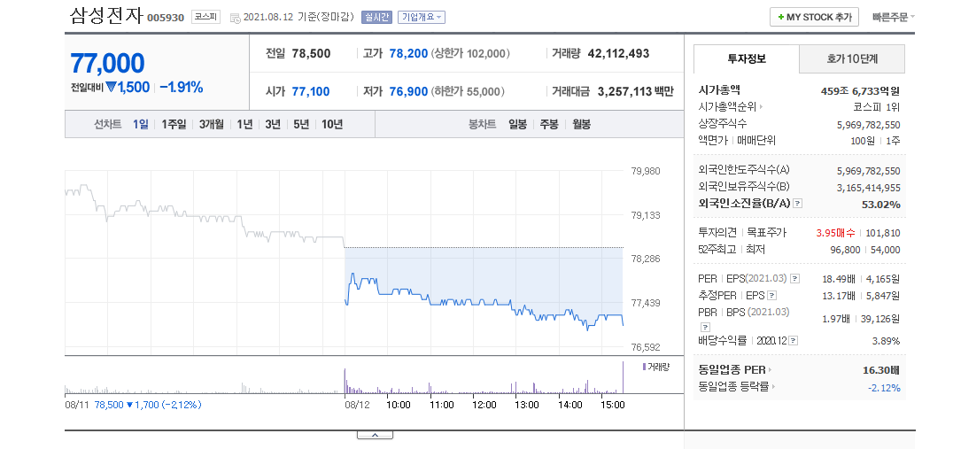 가능한 MTS를 보지 않으려 해서 모르고 있었습니다. 같이 일하는 사람이 "삼성이 왜 떨어지는 거야? 이재용이도 나왔는데?" 얼마나 떨어졌나 했더니 77로. 지금일까?라고 생각했지만 저 같은 무지렁이가 사고 싶다는 생각이 든다면 아마 저점은 아닐 겁니다. 그래도 78이 깨진 기념으로 77,100원에 구입을 했습니다. 내일 되면 더 떨어질 거 같다는 생각이 들어서 조금만. 만약 추가 하락이 된다면 조금씩 사모으려고요. 다시 6만 전자로 갈 수도 있겠죠.