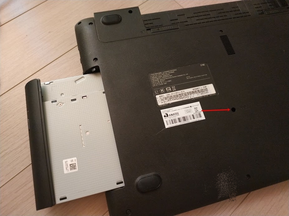 중간에 ODD라고 표시된 나사를 제거하고 DVD 드라이브를 댕기면 쉽게 탈착 됩니다.