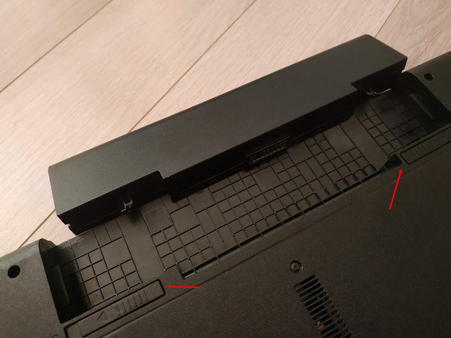 양쪽 스위치를 열림 표시로 이동시켜 배터리를 제거합니다.