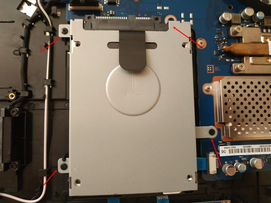 나사 4개를 풀어내고 PULL라고 표시된 곳을 붙잡아 당기면 하드디스크가 분리됩니다. 나사 4개를 다시 제거하고 하드 대신 SSD 넣고 다시 조립하면 끝.