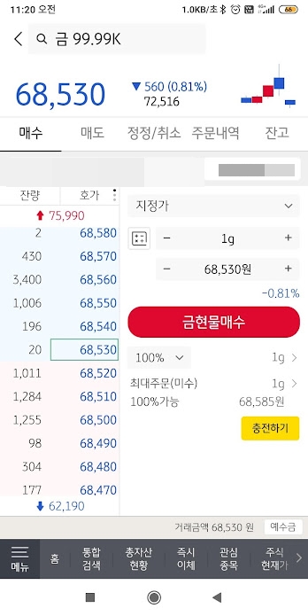 거래는 주식과 동일합니다. 금은 1g 단위로 거래할 수 있고 사고파는 방식도 비슷합니다. 1g 68,530원 매 매수를 했습니다. 거래 종목은 금 99.99k와 미니 금 100g 2 종목입니다. KRX를 통하면 비과세라는 점이 장점입니다. 금을 실제로 인출할 수도 있는데 그럴 경우에는 10% 부가가치세와 기타 비용이 추가됩니다. 대부분은 차익을 추구하니까 실제로 금을 인출을 할 일은 많지 않겠죠.