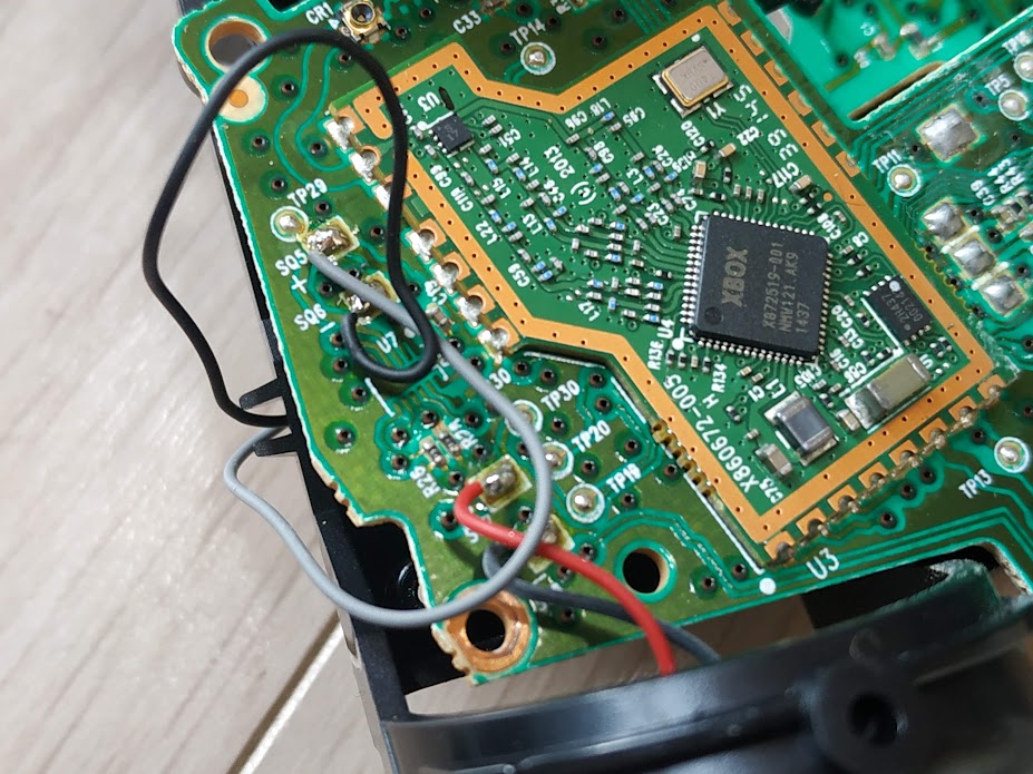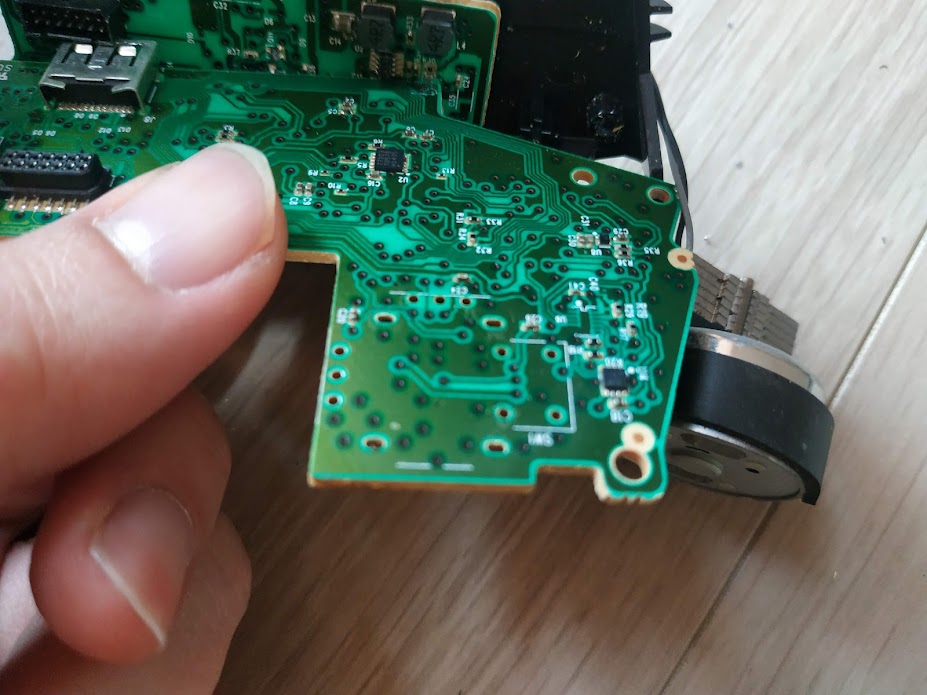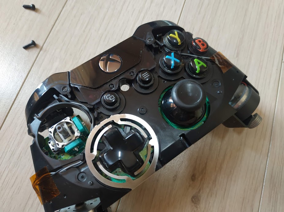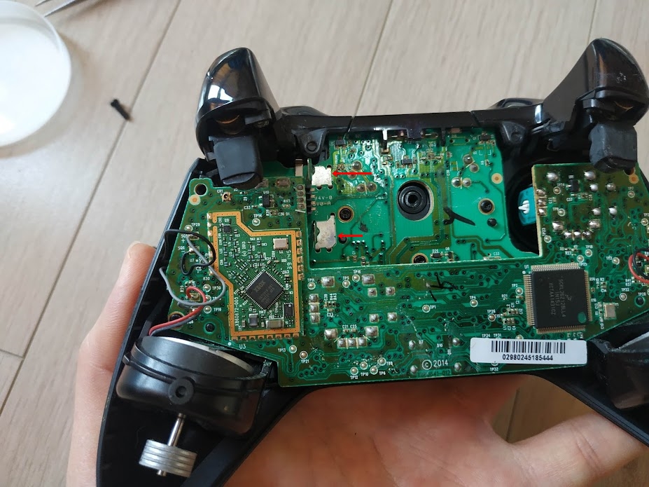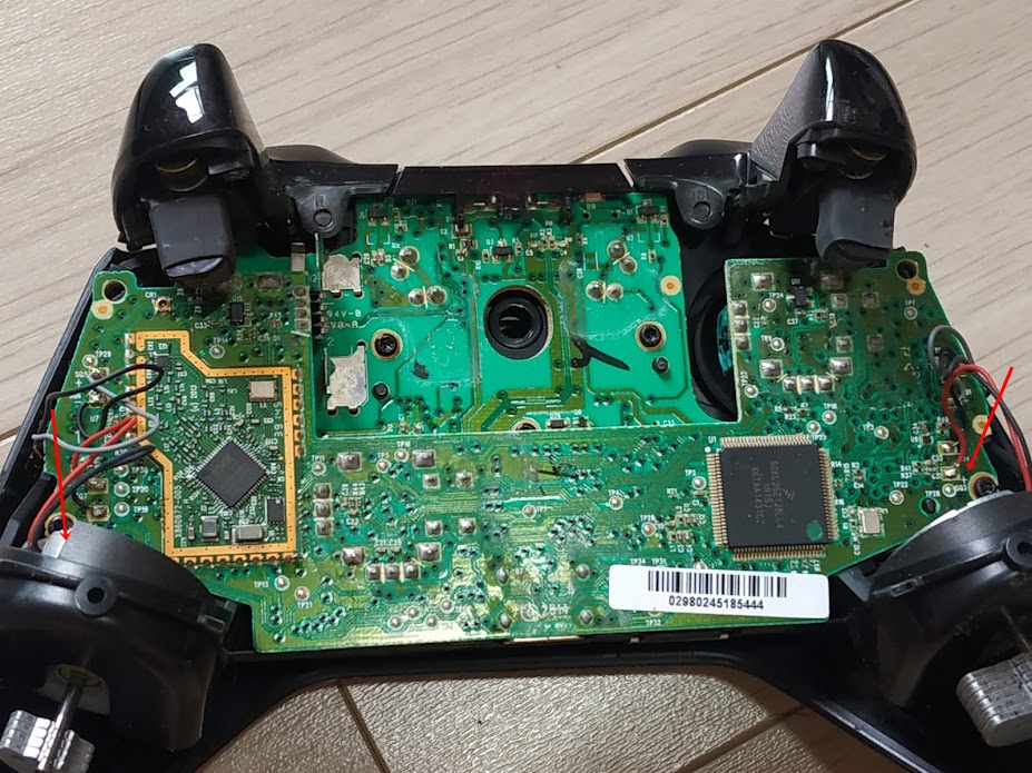 엑스박스 패드는 2개의 기판으로 이루어져 있습니다. 양쪽에 진동모터가 있고. 그 위에 나사 2개가 있습니다.
