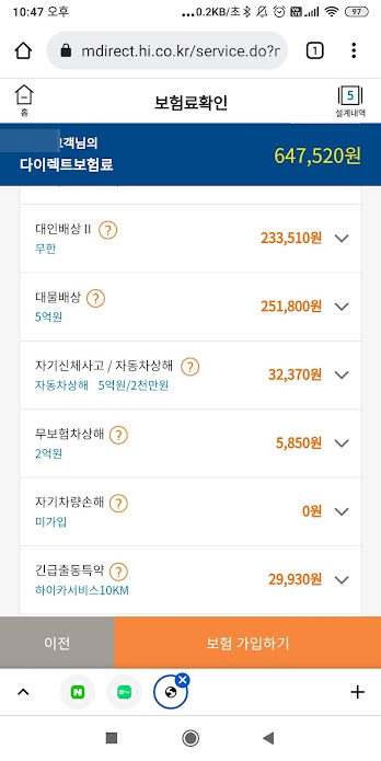 자기 차량 손해는 선택하지 않았습니다. 탈만큼 탄 중고차라서. 현대해상으로 가입을 했는데. 역시 PC에서는 가입이 되지 않습니다. 포기하고 폰으로 모바일 페이지를 통해 가입했습니다. 저놈의 보안 프로그램 때문에 PC보다 모바일이 훨씬 편합니다. 카드 결제 시 2~3만 원 캐시백이 있고요. 6년 차 자동차 보험은 이렇게 지나가는군요.