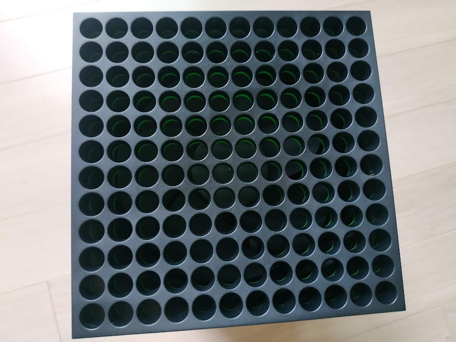짠. 요렇게 나옵니다. 실물을 보면 사진보다 더 좋습니다. 심플하게 잘 만들었다는 느낌을 받았습니다. 타공판 뒤로 쿨러가 보입니다. 작동시켜 보면 정말 소음이 없어서 놀라울 정도로 조용합니다.