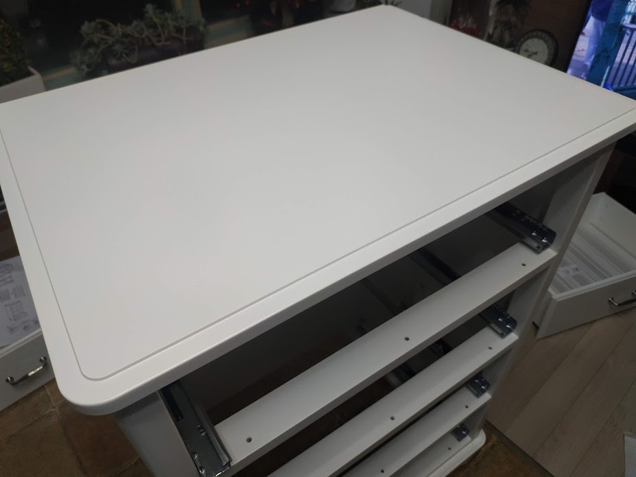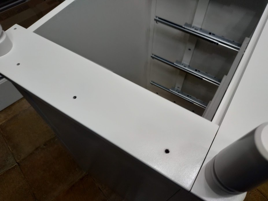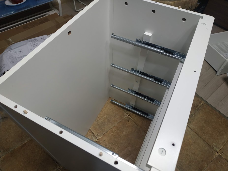 조립을 하다 보니, 품질 관리가 만족스러운 수준은 아닌 듯 보였습니다. 원가 절감인지. 다 완성시켜 놓으니 가장 윗 칸이 레일 부분이 다른 칸보다 더 튀어나왔더군요. 사용에 지장은 없고 겉으로 보기에도 문제가 없으나, 신경 쓰면 거슬리는 수준. 근데 다른 방법이 없어서, 다 조립을 하고 나면 어쩔 수가 없습니다. 분해해서 다지 조립할 것도 아니고, 빨리 완성시키기보다 천천히 야무지게 완성시키는 게 중요합니다. ( 하다 보면 힘들어서 빨리 하려고 함.)
