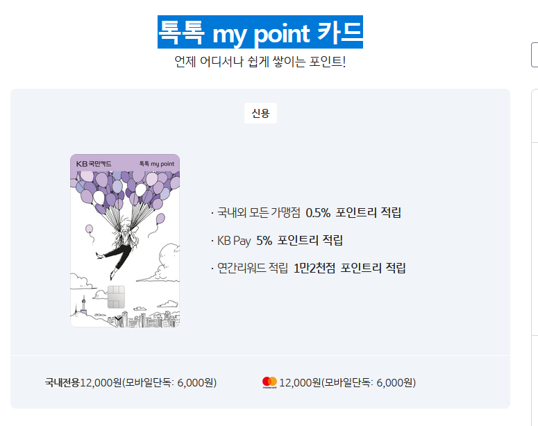 예전에 국민카드에서 굴비를 엮는 팁이라고 해서, 이런저런 카드를 발급받았습니다. 여러 개의 카드를 사용해서 혜택을 최대한 뽑아낸다는 의미였습니다. 카드사 혜택을 점진적으로 축소를 하고 단종되는 카드도 있기에 의미가 퇴색되었습니다. 의미가 퇴색되었다는 표현이 맞는지 모르겠지만요.😑 알 수 있는 사실은. 나에게 혜택이 있는 것은 살며시 사라집니다. 사라진다고 잘 알리지도 않습니다. 대신 별로 필요 없는 것은 혜택, 보너스랍시고 시시콜콜하게 알려줍니다. 단종이 되는 카드라는 의미는 소비자에게 유리할 가능성이 높다고 할 수 있습니다. kb국민카드에서 곧 톡톡 my point 카드를 단종시킨다고 합니다. 제가 사용하고 있는 카드는 아닙니다만. 특징을 살펴보면 무실적으로 kb 페이 결제 사용 시에 5% 적립시켜 줍..