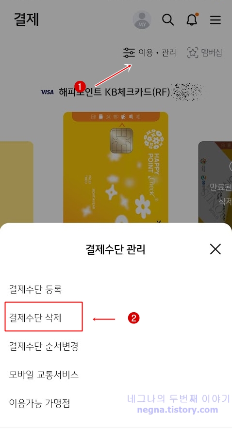 KB페이에 등록하여 사용하는 신용카드, 체크카드에는 유효기간이 있습니다. 유효기간이 지난 뒤에는 사용이 불가능하지만 등록이 유효하므로 삭제시켜 줘야 합니다. 삭제시키는 방법을 알아보겠습니다. KB PAY 앱을 실행하고 카드, 결제수단 관리 메뉴로 들어갑니다. 1. 이용관리를 터치하고. 2. 결제수단 삭제를 선택합니다. 3. 등록된 카드가 나열됩니다. 원하는 카드를 추가하거나 삭제시킬 수 있습니다. 여기서는 만료된 카드인 직장인 보너스 체크카를 선택해서 삭제시키면 됩니다.