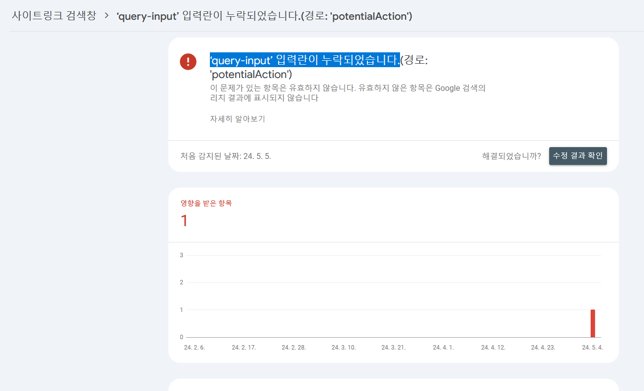 제 블로그 구글 서치 콘솔에서 알림이 하나 떴습니다. 심각한 주요 문제라고 경고를 하는데, 내용은 다음과 같습니다.https://negna.tistory.com/ Search Console에서 귀하의 사이트가 1개의 사이트링크 검색창 구조화된 데이터 문제로 인해 영향을 받는 것을 확인했습니다. 사이트에서 다음 문제가 발견되었습니다. 사이트의 사용자 환경과 Google 검색 노출을 최적화할 수 있도록 가능하다면 이러한 문제를 해결하시는 것이 좋습니다. 심각한 문제 중 주요 문제*‘query-input’ 입력란이 누락되었습니다.(경로: 'potentialAction')*심각한 문제가 있으면 페이지 또는 기능이 Google 검색결과에 표시되지 않습니다. 네. 읽어 봐도 무슨 소리지 전혀 알 수가 없었습니다...