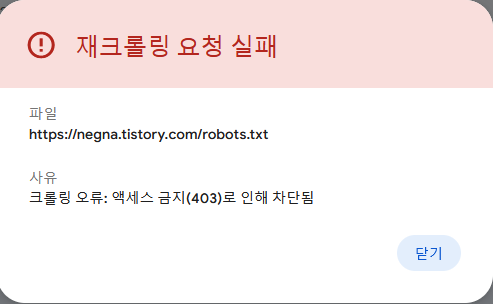 티스토리에 오류가 났다고 해더 구글 서치 콘솔에 접속했습니다. 설정에서 확인을 해보니. 네. 그렇네요. robot.txt 인식하지 못하고 크롤링 오류라고 나타납니다. 파일 1개 오류가 있음이라고 나타납니다. 4xx 문제로 차단됨이라고 표시됩니다.재크롤링 요청을 시도했으나 다음처럼 표시됩니다.재크롤링 요청 실패파일https://negna.tistory.com/robots.txt사유크롤링 오류: 액세스 금지(403)로 인해 차단됨티스토리 크롤링 오류는 월요일이 지나서야 해결이 되겠군요. 지금의 카카오는 도대체 무엇을 하는가? 묻고 싶네요. 들려오는 소식은 서비스 폐쇄밖에 없습니다. 운영 중인 서비스를 잘 유지하는 것 같지 않고요. 아니, 잘해보겠다는 의지도 없어 보이기도 합니다. 다음카카오의 최근 검색 점..