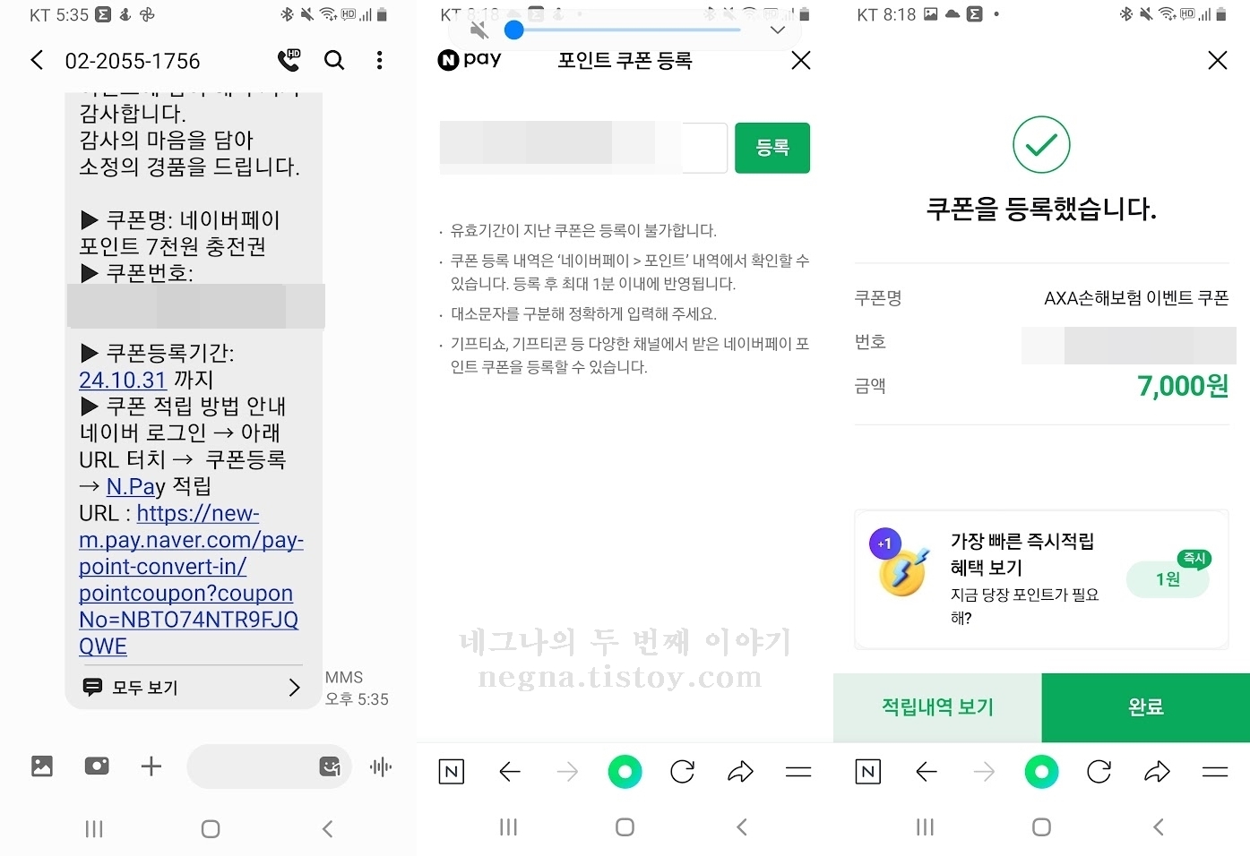 올해 자동차 보험을 갱신하면서 보험료 견적 이벤트에 참여를 했습니다. 올해만 참여한 게 아니라 늘 참여를 하기는 했습니다. 보험사들은 가입자를 유치하기 위해서 이벤트를 진행하는데요. 챙겨 먹을 수 있는 건 가져가야죠. 참여한 보험사 중 하나사 악사(AXA) 손해보험이었습니다. 1달 뒤에 네이버 페이 쿠폰을 보낸 준다고 했었는데. 완전히 잊고 있었습니다. 글을 쓰고 있는 시점에서 어제. 쿠폰이 문자 메시지로 왔습니다. 등록을 시키는 방법은 어렵지 않습니다. 네이버 페이 링크를 눌러서 쿠폰을 등록시킬 수 있습니다.보내주기는 하네요. 지난번에도 적었지만 가장 빨리 보내주는 건 삼성이었습니다. 쿨하게 보내주고. 어디였더라? 분명히 참여를 했었는데, 이벤트 혜택을 주지 않는 회사가 있었습니다. 절차대로 했음에도..