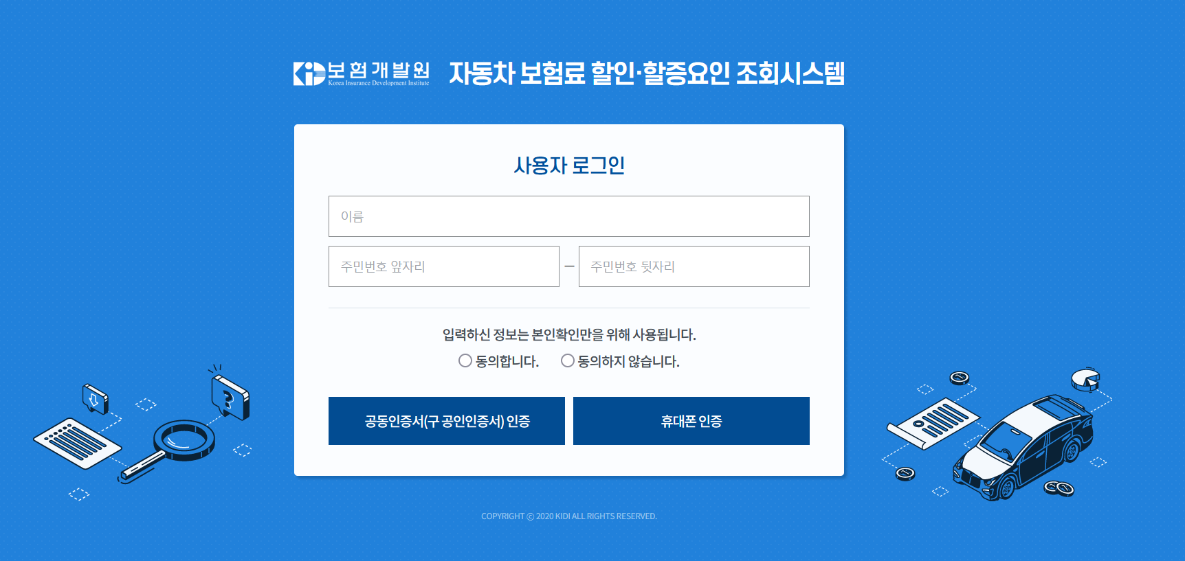자동차보험은 하나식 가지고 있을 텐데요. 보통은 장기간 무사고일 경우 할인이 되지만 그렇지는 않은 경우도 있나 봅니다. 차량 등급이 바뀌기도 하고요. 최근에 알게 되었는데, 자동차 보험료 할인·할증요인 조회시스템이 있습니다. 보험개발원에서 제공하는데. 내가 모르는 서비스가 참 많군요. 아래 링크로 접속을 한 뒤. https://prem.kidi.or.kr:1443/loginPage.do본인인증을 통해서 로그인합니다. ( 회원가입 필요 없음, 휴대폰 인증으로도 됩니다.) 개인정보 수집에 동의를 하고요.KB손해보험(Tel : 1544-0114)현대해상(Tel : 1588-5656)2023.06.07 ~ 2024.06.07 2024.06.07 ~ 2025.06.07 -51.8%-52.7( 前 계약 대비 ..