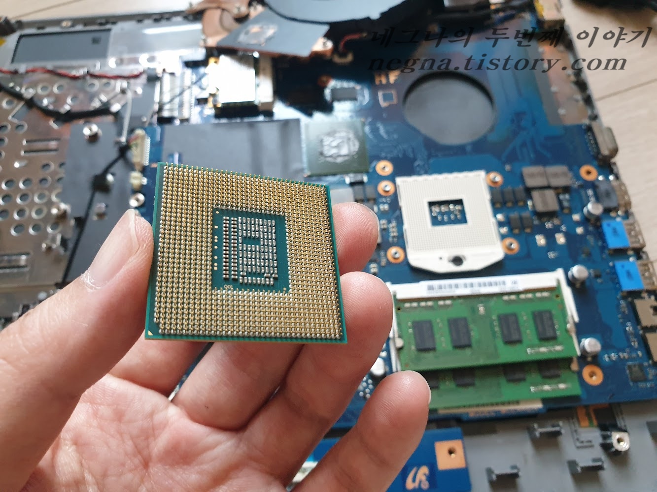 고장이난 삼성 노트북에서 부품 추출합니다. 그러기 위해서는 노트북을 분해를 해야겠죠.커버를 열고 꺼낼 걸 꺼내줍니다. 풀어야 할 나사가 제법 많네요. 구형 노트북에서 탑재되어 있는 DVD 롬 드라이브. 노트북 케이스를 벗겨내고 메인보드가 드러났습니다. CPU를 보면 알 수 있습니다. 이 모델은 CPU 교체가 가능하다는 걸. CPU를 감싸고 있는 쿨러를 분리시켜야 합니다. 나사를 풀어주고. CPU 소켓에 장착되어 있는 상태. 분리는 아래 홈을 일자 드라이버로 돌리고 나면 CPU를 빼낼 수 있습니다. PC용 CPU 정보는 히트 스프레더에 있는데요. 모바일 CPU에는 없죠. g26956 01로 검색을 해보니까. Intel® Core™ i5-3210M Processor입니다. 해당 모델의 간단한 사양표.P..