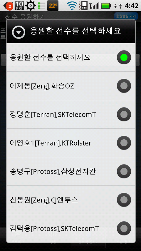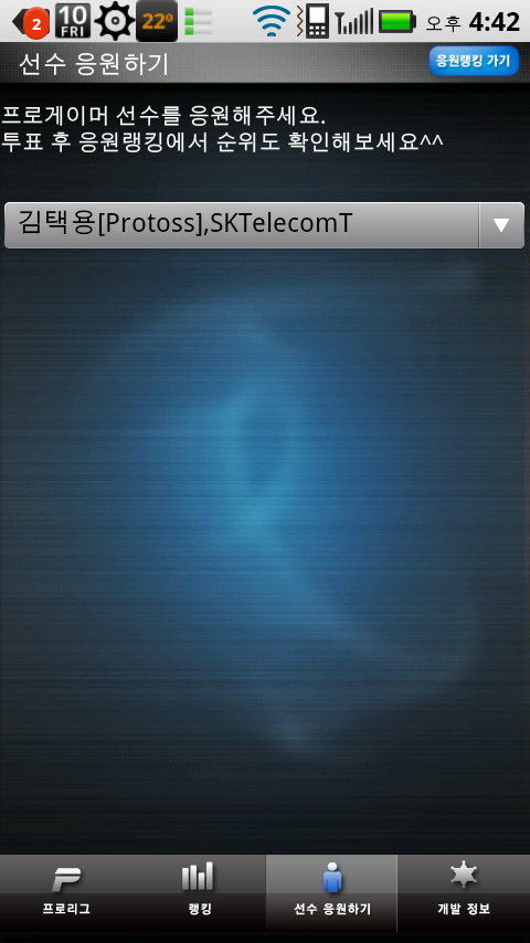 선수응원하기 항목도 있습니다. 가수 박완규가 김택용의 열렬한 팬이라고 해서 한 번 선택해봤습니다. 요즘은
